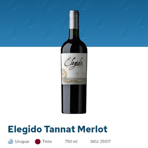 Elegido Tannat Merlot Apresenta aromas de frutas vermelhas muito maduras. Em boca é seco, possui boa acidez, corpo médio, taninos macios e final harmônico. FICHA TÉCNICA: Classificação: Seco Região: Canelones / Uruguai Temperatura: 16 a 18ºC Teor Alcoólico: 12% Uvas: Tannat, Merlot Volume: 750 ml ANÁLISE SENSORIAL: Visual: Vermelho intenso Olfativo: Apresenta aromas de frutas vermelhas muito maduras. Gustativo: Em boca é seco, possui boa acidez, corpo médio, taninos macios e final harmônico. Harmonização: Acompanha carnes vermelhas, churrasco e massas com molhos de carnes.