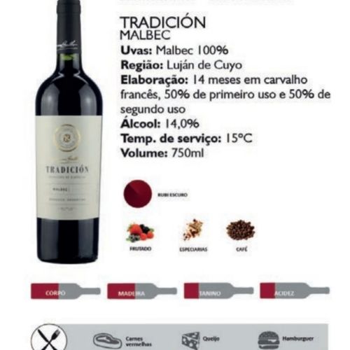 A História dos rótulos da vinicola é uma homenagem a todos, Crios para seus filhos, Benmarco para os homens, Signature homenagem a sim mesmo, Nosotros está feito para todos e o tradicion foi feito especialmente para o Brasil. Bastante aromático, traz o frescor das frutas silvestres, cereja fresca, ainda no pé com uma pitada doce da compota de ameixa, além das notas de violeta e sutis notas de baunilha com uma giradinha e outra. Em boca, as frutas parecem amadurecer, e é lá que aparecem notas de caramelo, violeta e toques tostados. Amadurecimento: Em madeira por 14 meses. Aromas: Aromas de cereja fresca, que ganha sutis notas de baunilha Paladar: Notas de caramelo, violeta e toques tostados. Elaboração: 14 meses em carvalho francês, 50% de primeiro uso e 50% de segundo uso, Temperatura de Serviço: 15 Graus. Harmonização Carnes vermelhas, carnes suinás e queijo. COMPOSIÇÃO DA UVA: Malbec. AMADURECIMENTO: 14 meses em carvalho francês, 50% de primeiro uso e 50% de segundo uso.